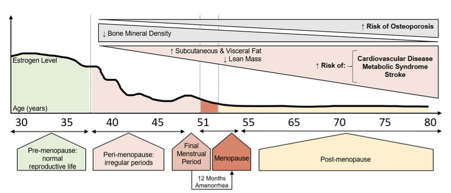 Gedurende de overgangsfase (perimenopauze) neemt het lichaamsvet toe en kent het vet een verschuiving naar visceraal vet. Dit verhoogt het risico op cardio-metabole aandoeningen en heeft dus een negatieve invloed op de algemene gezondheid. Daarnaast kennen postmenopauzale vrouwen een vermindering van vetverbranding tijdens een inspanning (Gould, L.M. et al., 2022; Marsh, M.L. et al., 2023). Bijkomend kent het vrouwelijk lichaam ook een significante daling in spierkracht en -vermogen gedurende de overgang naar de postmenopauze (Bondarev, D. et al., 2020). Door de verschuiving van het lichaamsvet, de vermindering van vetverbranding na de menopauze en de afname van de spierkracht en het spiervermogen, is het van belang om tijdens de perimenopauze beweging te gaan inzetten als hulpmiddel. Hier gaan we in het volgende onderdeel nog dieper op ingaan.